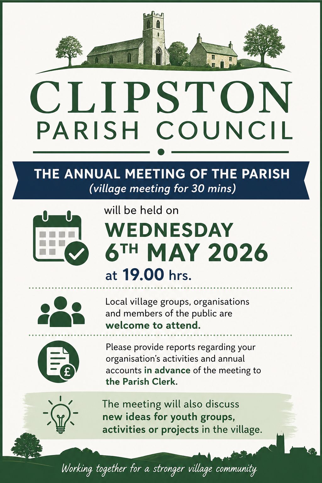 Annual Parish Meeting Invite 6th May 2026 at 7pm Join us at the Annual Parish Meeting, a friendly and welcoming gathering for all local residents and groups to learn about parish activities, share ideas, ask questions, and connect with your community and local representatives.